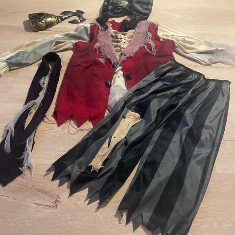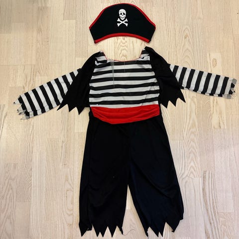 Disneyn uutena ostettu ja pari kertaa yhdellä lapsella käytössä ollut merirosvoasu kokoa 104cm. Asuun kuuluu housut, joissa vyötäröllä kuminauha, kiinteä paita/liiviyhdistelmä sekä bandanahuivi. Ei nimikointia.