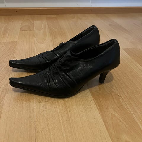 Kengät ovat olleet käytössä, ja kulumaa näkyy erityisesti korkolapuissa, jotka kaipaavat vaihtoa (katso kuvat). Tämä on huomioitu edullisessa hinnassa.
