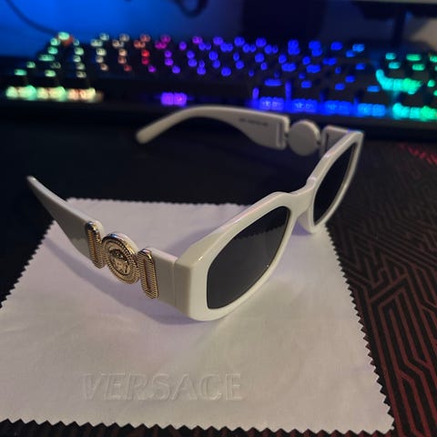 Kuvan vähän käytetyt, siistikuntoiset, ehjät pinkit Versacen aurinkolasit ilman voimakkuuksia. Linssit punertavat. Ostettu Instrumentariumista pari kesää sitten.