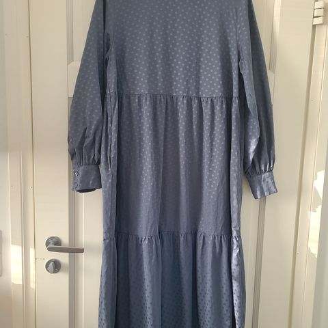 Mekon levenevässä helmassa on leveät poimutetut kaitaleet. Mekon täyspitkät hihat poimuttuvat runsaasti hihansuun kaitaleen yläpuolelle. Materiaali on kauniisti laskeutuvaa ja kevyttä lyocell-polyesterikangasta, jossa on kudottu pallokuosi sävy sävyyn.