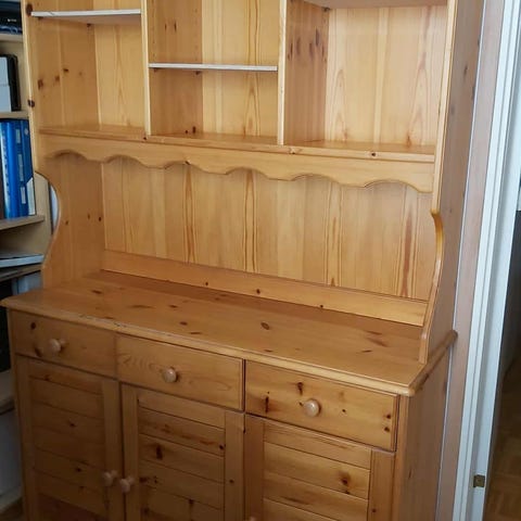 Mitat K186 x L122 x S41,5 cm, ylähyllyjen syvyys 25cm, lisähyllyt ei alkuperäiset.