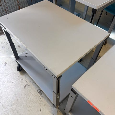 Kestävä treston pöytä hyllyllä ja pistorasioilla. Korkeus aika hyvin säädettävissä että pitempikin kaveri voi asentaa pöydän seisontatyöskentelyyn.