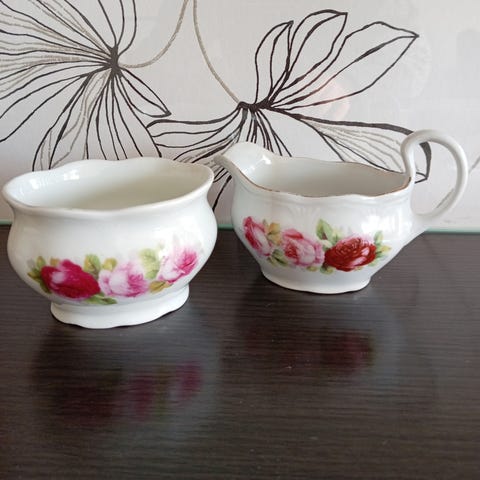 Arabia Morsian -sarjan sokerikko, kermakko ja tarjoilulautanen. Tuotannossa 1971-1976. Lautasen halkaisija 26 cm. Hyvässä kunnossa. Mielellään nouto.