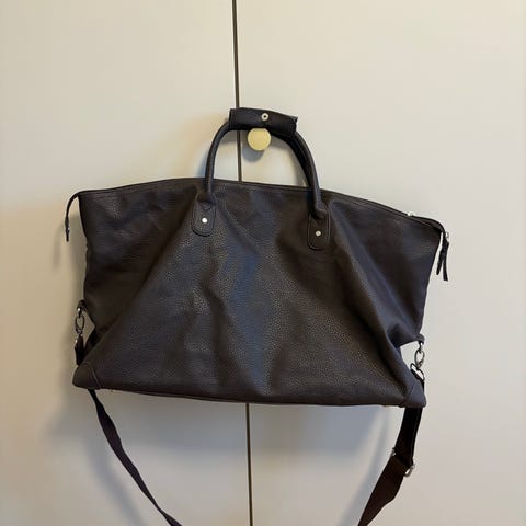 Ei uusi, mutta käyttämätön kassityyppinen laukku. Molemmilla sivuilla sivutasku. Sisällä vetoketjullinen tasku. Laukun leveys ylhäällä on 43 cm ja korkeus 35 cm.