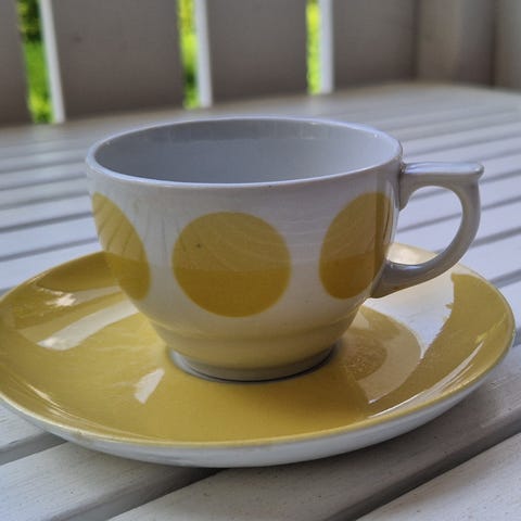 Mitat: kahvikupin halkaisija 8,5 cm, korkeus 5 cm, asetin halkaisija 13 cm ja pullalautasen halkaisija 17 cm. Mielellään nouto.