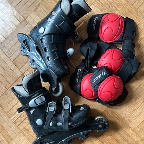 Rullaluistimet koko 42, sisämitta n 30 cm. Polvi-ja rannesuojat Turbine Softmax kokoM. Pari muutakin suojaa.Turbine kypärä koko L.
