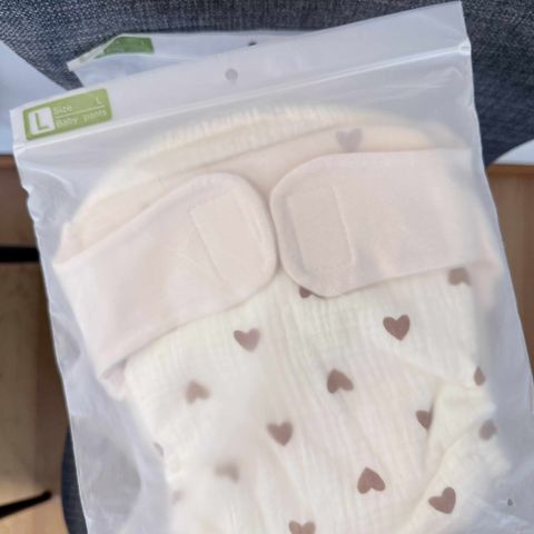 Luonnonvalkoisesta Ruskovillan hahtuvalangasta neulotut käyttämättömät vaippahousut. Housuja ei pesty eikä huovutettu. Koko L: leveys 29 cm, korkeus 29 cm