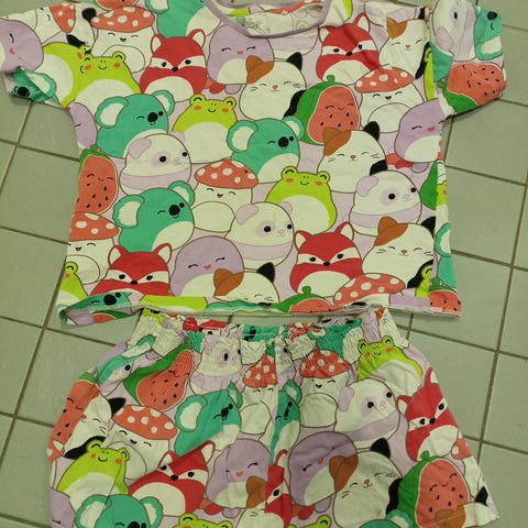 Keltainen jäätelö kesä-asu. Setti on kellertävämpi mitä kuvassa. Housuissa taskut. Koko 134
