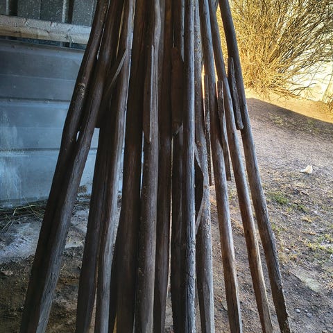 Hay poles for sale, old and used but in good condition. Handmade and authentic. There are around 300 poles with different sizes and lengths, as can be seen in the photo. 4 e each and the prize is negotiable if you buy many of them.