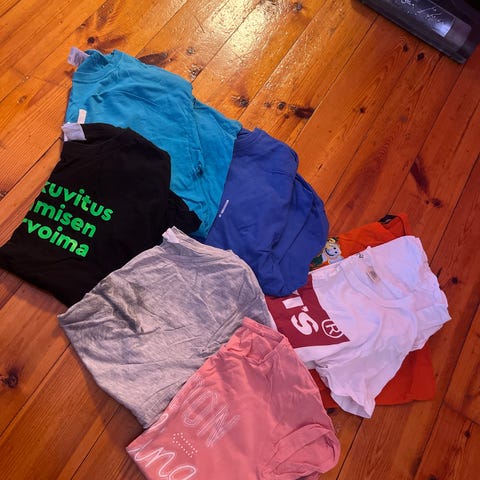 T-paidoista värejä; Tummansininen, keltainen, valkoinen, vihreä, harmaa, punainen, sininen ja musta. Kokoja 1-14 vuotiaille.