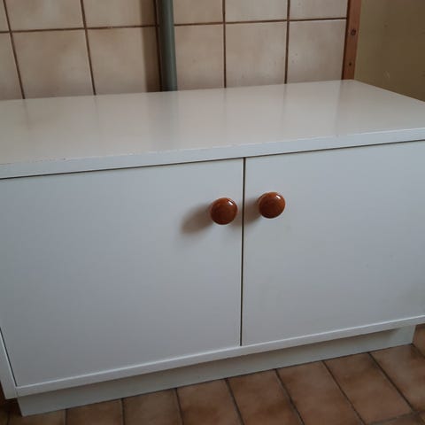 Kaappi ollut ruskea. Maalattu valkoiseksi. Vähän näkyy ruskeata . Sisällä kenkähylyteline ja tanko.
