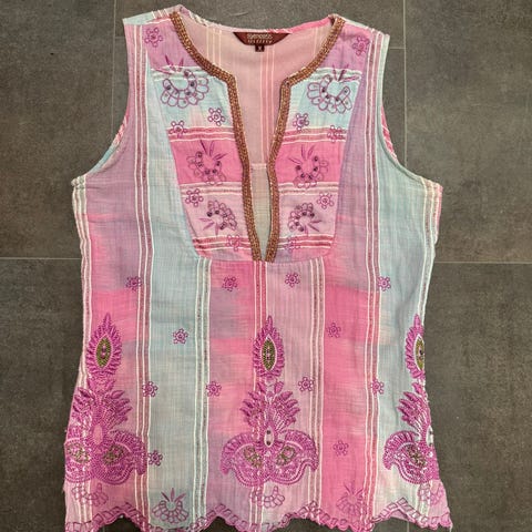 Puuvillainen ohut pusero. pituus 56cm, vyötärön ympärys 96cm, pieni jousto takana. Kauniit koristelut yläosassa, hihansuissa jousto ommel. Nouto tai postitus jolloin kulut lisätään hintaan.