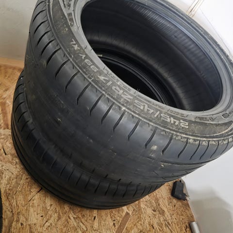 Kuvanmukaisia renkaita siirtoon, peräkärryyn tai vaikka kukkapenkiksi. Kumeissa pintaa, mutta vanhat.