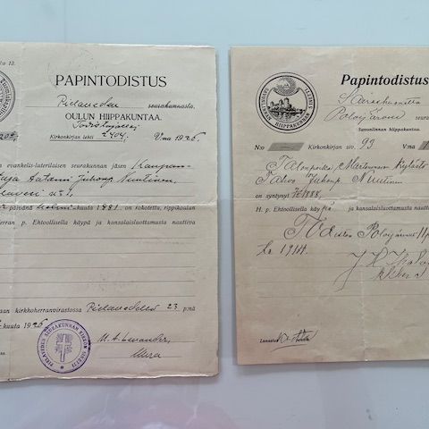 Katso kuvat: lääkärintodistus vuodelta 1908, paperin sinetti hienosti säilynyt, lisäksi vanha leimamerkki.