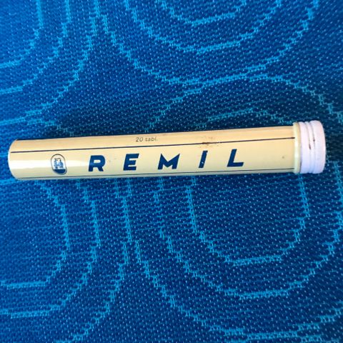 Peltinen vanha purkki, jossa kaksi etikettiä.