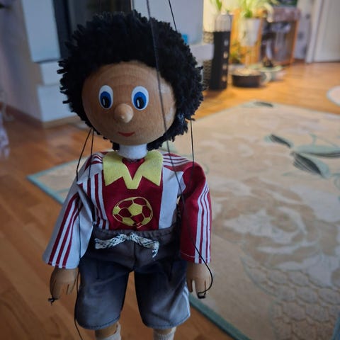 Hellyyttävä käsintehty liikkuva Charlie Chaplin marionettinukke Tsekin Prahasta, ikää Charliella nyt 23v. Liikkuu edelleen hienosti. Hartialeveys 13 cm. Hatun päältä jalkapohjiin mittaa 42 cm.