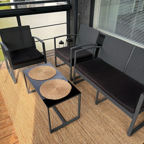 Myydään terassi kalusteet, ehjät ja hyvässä kunnossa. Jalkojen sisältä tullut vähän ruostetta kastuessaan mutta ei mitään näkyvää vikaa.