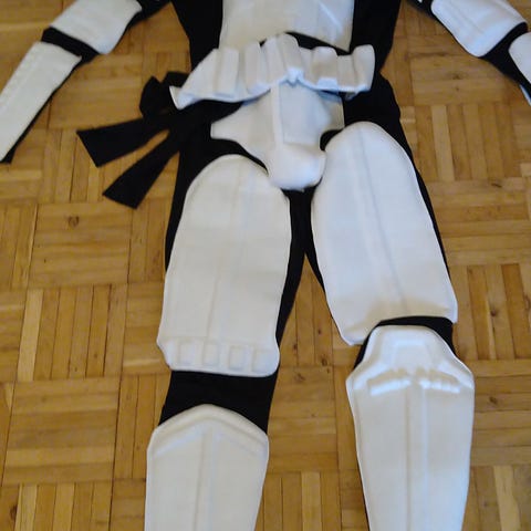 Punanaamiosta ostettu, aikuisten Stormtrooper naamiaisasu koko L, käyttäjä ollut n. 190cm pitkä. (puntit toki roikkuivat silloin ilmassa). Sis. Puku, vyö ja ”kypärä”. Mustat osat ohutta joustavaa kangasta, joten menee monen kokoiselle käyttäjälle. Kerran käytetty, mutta käytön jälkiä on luonnollisesti, kun mm. hakaneuloilla kiinnitetty olkaosia, jotta ne ei jääneet pukua käyttäessä ilmaan killumaan. Nouto mahdollista esim. Ideaparkilta. Maksu käteinen tai MobilePay.