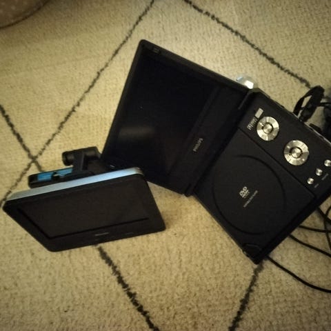 Dvd-soitin autoon elokuvien katseluun. Mukana laukku, virtajohto, kuulokkeet ja kaukosäädin.