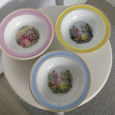 Arabian vanhat kulhot, kaikki ehjiä ja siistejä, yksi erittäin hyväkuntoinen, yhden reunassa kolme tummaa kohtaa, yhdessä kuviot haalistuneet, yhdessä hyvin pientä kuvion kulumista, halkaisijat 12,5 cm, 17 cm, 19,5 cm ha 22,5 cm, en myy erikseen, postitan ja pakkaan hyvin, hinta 30 eur/4 kulhoa