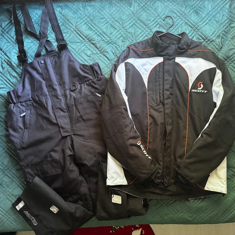 Pyörä lähti, puku jäi. Scottin puku, jota käytetty 3 kertaa, kun poistuttu kotikylästä. Mies osti puvun, mutta polvioperaation jälkeen pyörästä jouduttiin luopumaan ja nyt lähtisi tämä käytännössä uusi puku. Ostettu uutena liikkeestä ja näemmä osassa sisäpuolen vetoketjuja vielä suojamuovit vetimissä.