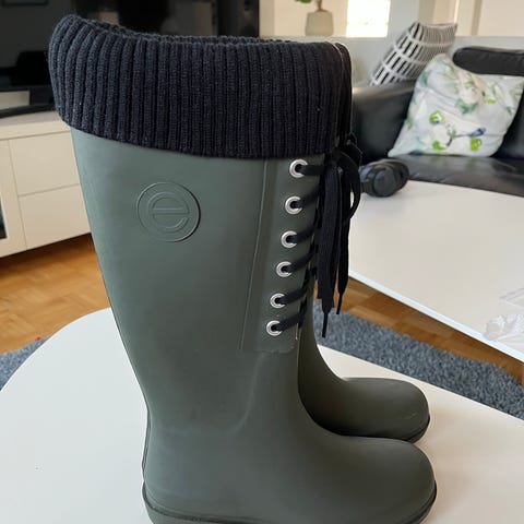 Käyttämättömät matalavartiset naisten Nokian- kumisaappaat. Saappaiden pinnassa on tummaa sävytystä (ei likaa) keltaisella pohjalla, kuuluneeko ko. mallin väritykseen vai onko säilytyksessä tullut? Kun saappaat kuitenkin ovat käyttämättömät kuten pohjista ja sisustastakin näkee!
