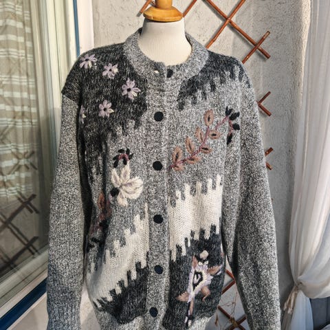 Vintagehenkinen 90-luvun Artesaniaksen mohairneuletakki, musta vuori. Kaksivärinen, missä mustat mokkanahan tyyliset kangaskoristelut helmikoristein edessä ja selän puolella. Reilu koko L/XL, kevyt takki. Samettipintaiset mustat napit. Olkatoppaukset (kätevä saanee poistettua halutessaan).