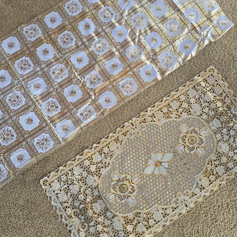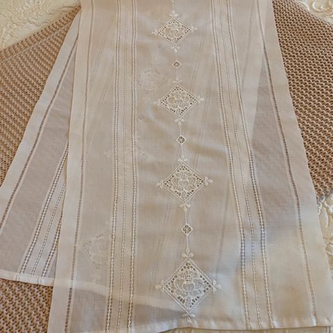 Kuvan vaalean sinistä pitsi kaitaliinaa. Leveys 30 cm. Eri mittaisia pätkiä.