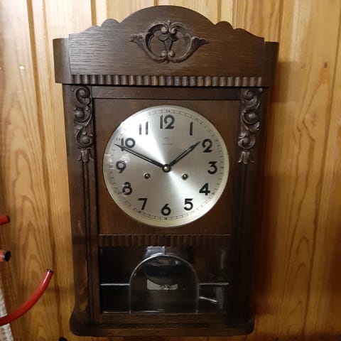 Junghans seinäkello, jossa takana merkintä vuodelta 1922. Siistissä kunnossa, mutta vaatii huoltoa. Avain tallessa. Vuoden 2024 marraskuun huutokaupassa mennyt yli 300 euron hinnalla. Hp. 120 e/tarjous.