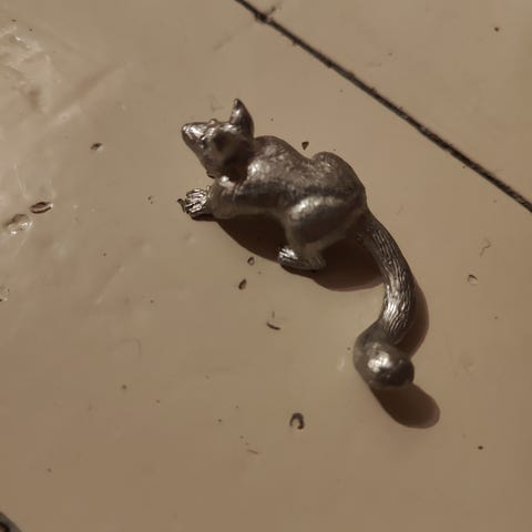 Lila vihreä käpertyvä pieni otus vaaleanpunaisessa kuljetuslaatikossa