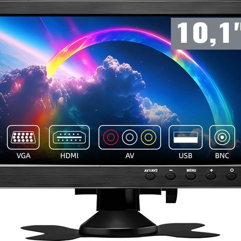 Tämän kannettavan mininäytön näytön koko on 10,1 tuumaa, resoluutio 1024 x 600 pikseliä ja näyttösuhde 16:9. Pieni ja kannettava koko sopii moneen käyttötarkoitukseen.