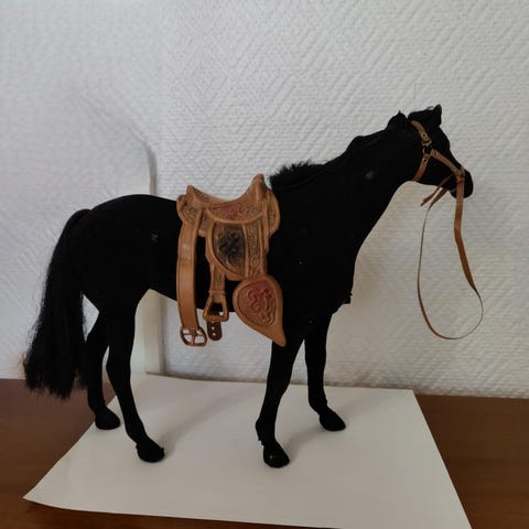 Hyväkuntoinen isompi hevosfiguuri. Pieniä kulumia paikoittain, hieman nukkaantunut ja joistain kohdista tummunut.