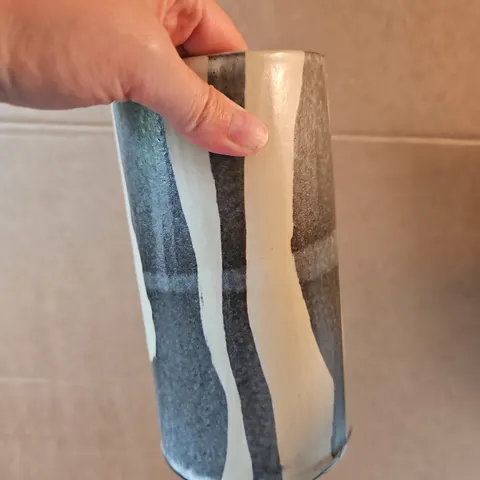 Koristeellinen ruukku/maljakko, täysin ehjä, korkeus 30 cm, pohjan halkaisija 9 cm, aukon halkaisija 11 cm, suurin leveys 16 cm.