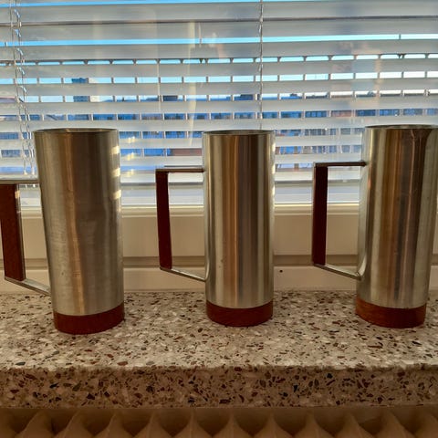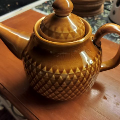 Kaunis tinakaadin hattuineen. Pewter Haugrud Norway 335. Jotkut myyvät kahvin kaatimenakin. Kirkas sisus, niin kai tuota voi kahvikannunakin käyttää. Minulla ollut koristeena. En ole kiillottanut, niin saattaisi säihkyä kirkkaamminkin 😀