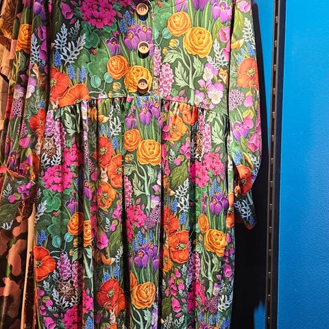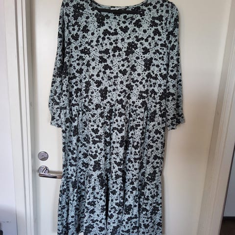 Suomalainen Kude design Mimmi Metsäkukka mekko trikoota, Kk 57cm ja oh 96cm, joustaa. Levenevä malli, hyvät taskut ja hihat kyynärpäihin asti. A-linjainen.