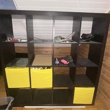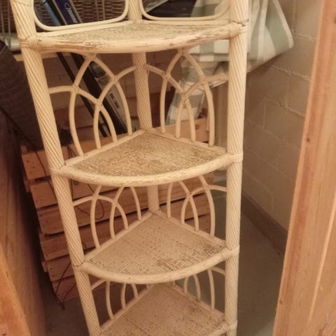 Kuvan valkea rottinkinen hylly, lehdille tai muulle tavaralle. Ehjä peli, Nouto ja käteinen.
