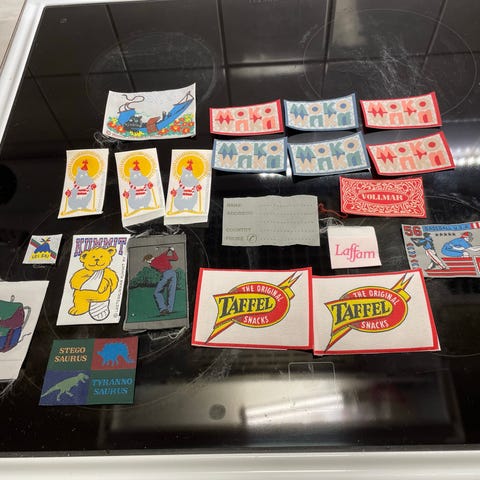 Suuri määrä erilaisia ommeltavia kangasmerkkejä ja silitettäviä kangasmerkkejä. Ensimmäisessä kuvassa kaikki , mitä tällähetkellä myynnissä. Joissakin liimapinta voi olla kuivahtanut koska osa on todella vanhoja! Eli kannattaa varautua siihen että merkki täytyy ommella. Kaikissa materiaali kangasta tai on brodeerattu. Mittoissa voi olla parin mm heittoa.