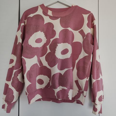 Marimekon vaaleanpunainen raidallinen collegepaita, rinnassa pieni Unikko. Koko S.