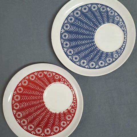 Hyväkuntoinen lautanen, josta kuppi puuttuu. Muuten oikein hyvä, mutta alla pieni puute lasitteessa. Ei rikkoja. Normaalia käyttökulumaa.
