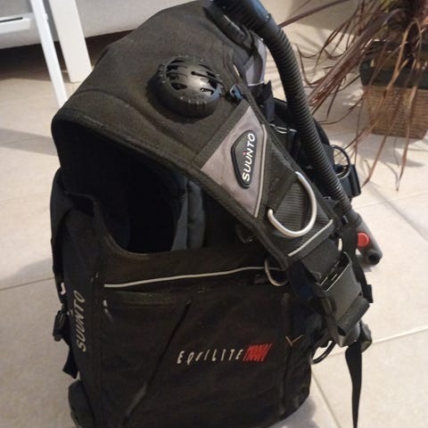 Suunnon takkiliivi. Sukellettu viimeksi kesällä 2024, toimii niin kuin kuuluukin. Liivin oma joustoremmi vaihdettu kiinteään, mutta säädettävään hihnaan. Ei vuoda.