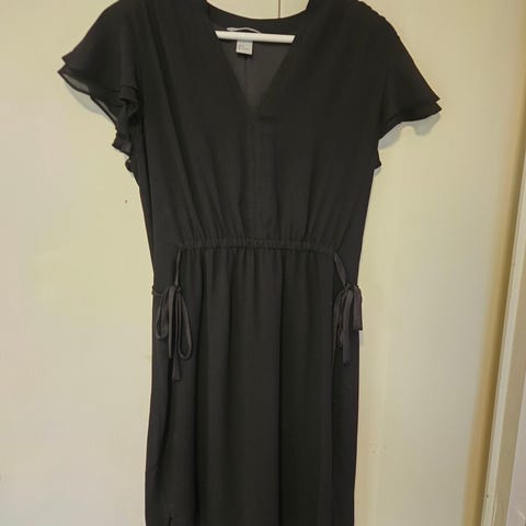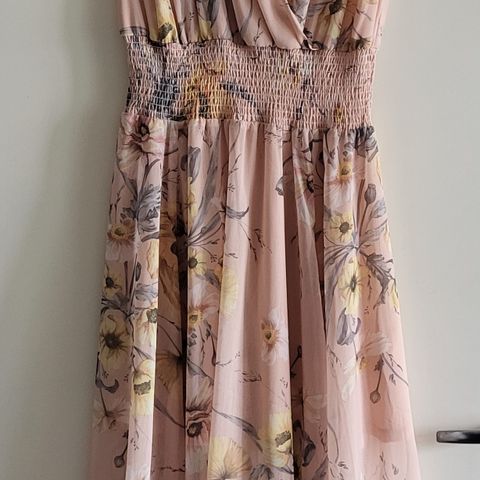 Kuvan musta mekko, säädettävillä olkahihnoilla. Alaosan kukkakuviot on koholla.
