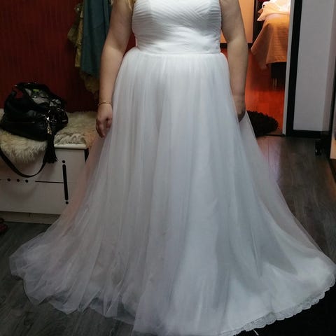 Täysin uniikki oma design ja toteutus ompelimossa. Kokonaan vuorattu, yläosa myös luonnonsilkkiä, alaosassa paksu alushame ja tylli. Parhaiten helman leveys tulee esiin kun hankit myös vannealushameen. Minulla oli laina vannehame häissä.