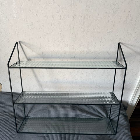 Korkea ja kapea esittelyseinä alaosan kaapilla ja muutamalla koukulla. Koukkuja ja lisäosia voi hankkia lisää. Väri koivu ja seinän tausta musta. Metalliurat. Kunto erinomainen, ei mitään mainittavaa.