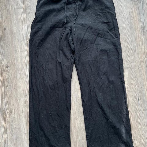 Aivan ihanat pehmeät uudet kesähousut. Harmikseni ostin liian isot, vyötärö 50 cm. Täysin mustat, kuva haalistaa väriä. 55 % pellavaa, 45 % viskoosia