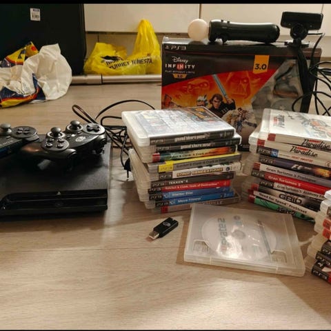 Todella vähän käytetty konsoli, ollut uudesta asti meillä. Ohjaimista en tiedä missä on mutta saa mukaan jos löytyy muuton alta. Katsottu joskus leffoja ja pelattu gta v läpi. Siinä käyttö. Mukaan läjä blueray ja dvd leffoja. Pelit kuvassa, kaikki pitäs toimia, ei ole ollut lapsiperheessä käytössä. Grand theft auto 3 peliä, need for speed jne.
