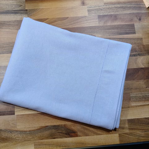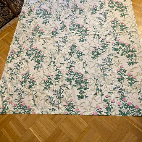 Harmaasävyinen kukallinen pöytäliina. Ei tahroja. Pesty hajusteettomalla Ecover pesuaineella.