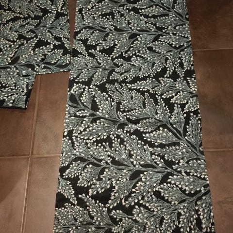 Valkoinen valmis verho, sivureunoja ei ole ommeltu.