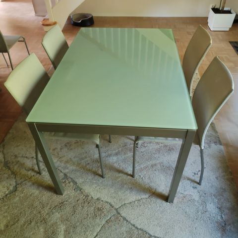 Suklaan ruskea pöytä ja neljä tuolia. Kaunis väri ja loistavan kokoinen. Harmi vaan että erään kerran kynttilä roiski liekkejä pöydälle. On korjattu, mutta arvet jäivät. Tuolit ovat siistit.