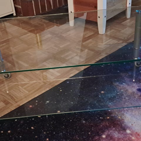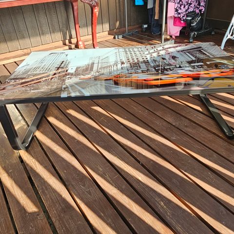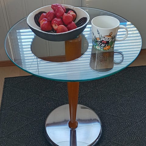 Tyylikäs moderni lasinen pikku pöytä, jossa myös kromia. Kuin uusi, aivan pieni lommo jalkaosan päällä. Koko korkeus 85 cm, pöytätason korkeus 60 cm, pöytätason halkaisija 40 cm. Nouto Raumalta.