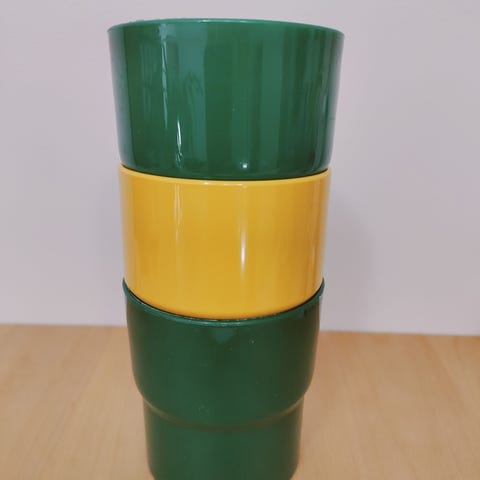 2 kpl, keltainen ja vihreä, Sarvis 70-luvun astiasarjan korvallisia mukeja nro 459.
